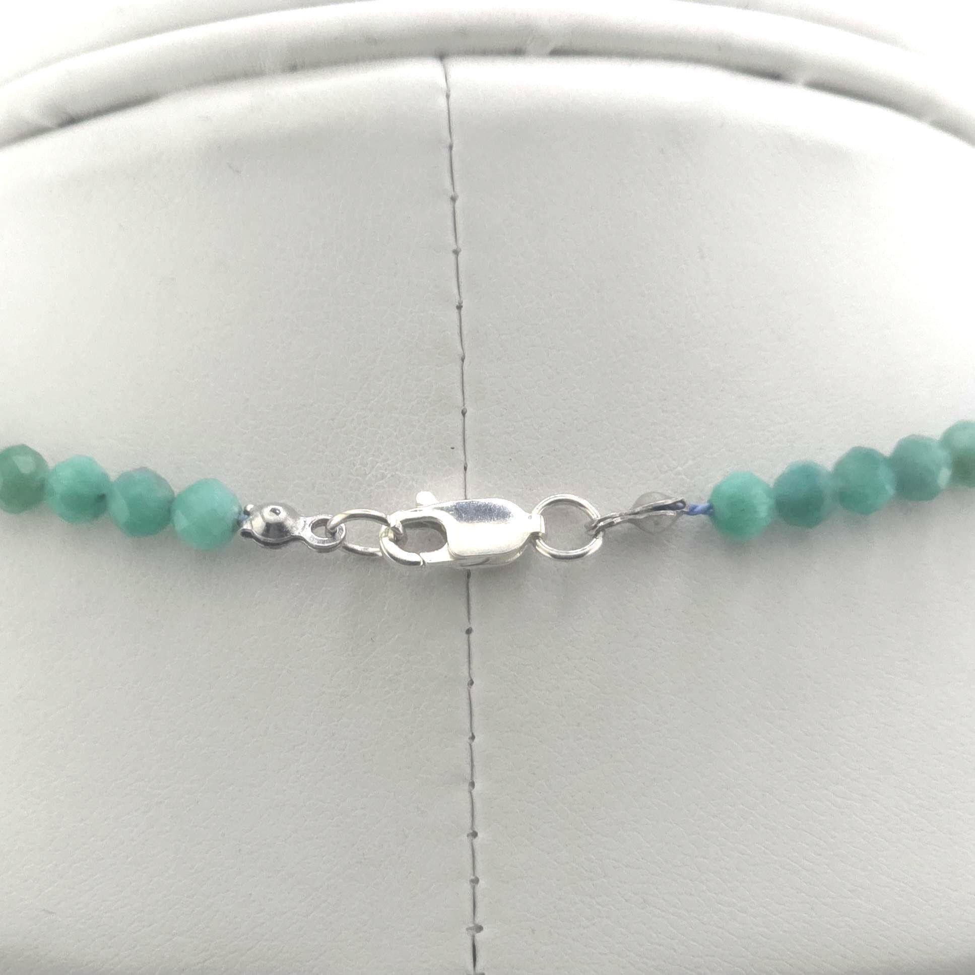 This single strand choker/necklace is made from all natural 4mm faceted AAA Amazonite on silk. It has platinum-plated sterling silver and high quality stainless steel findings, and is finished with a high quality stainless steel magnetic clasp. The hypoallergenic version comes with all pure Argentium silver findings and will not cause a reaction with your skin and the metal.