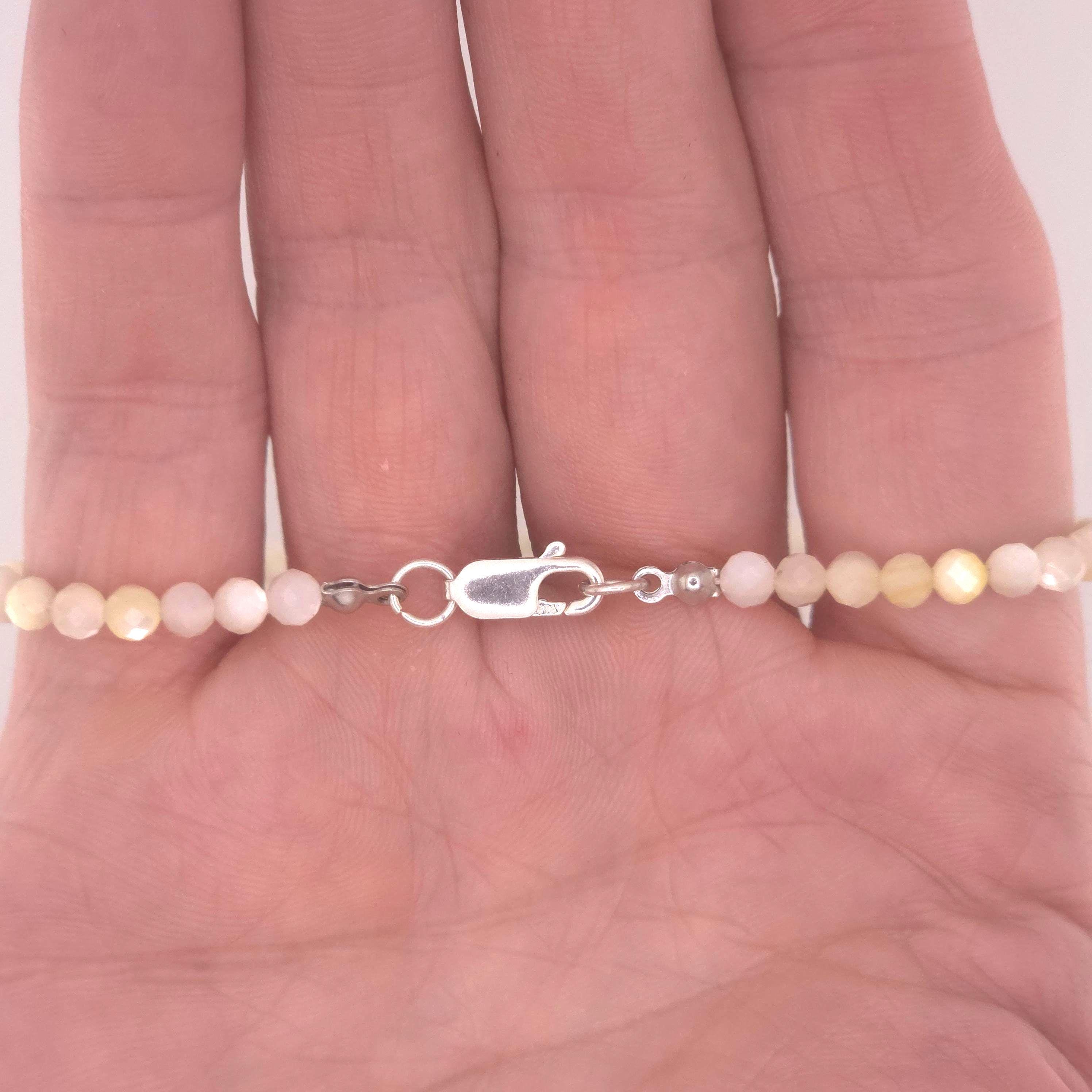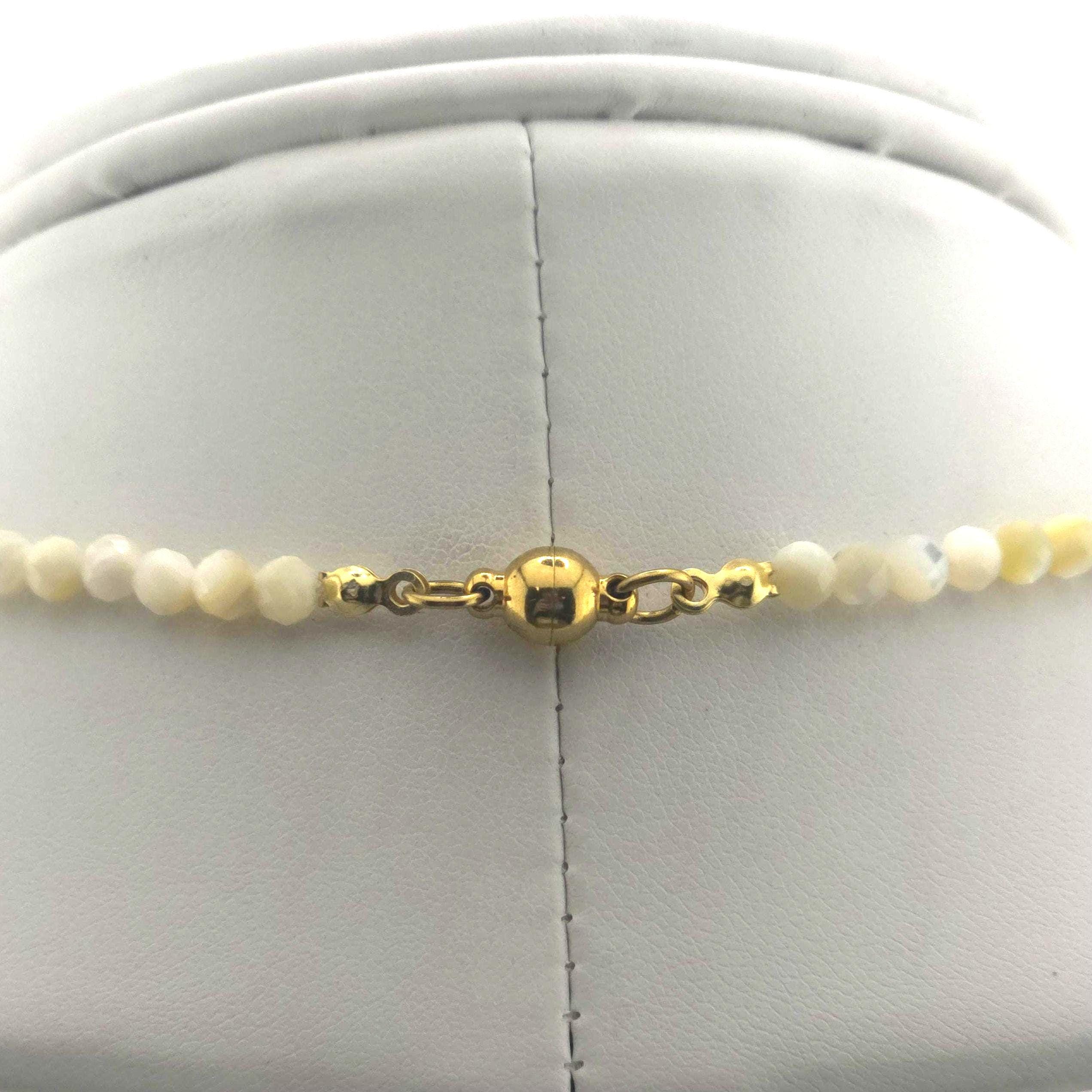 This single strand choker/necklace is made from all natural 4mm faceted Tan Pearl Shell on silk, made to the size of your choosing. It has gold plated sterling silver and high quality stainless steel findings, and is finished with a high quality stainless steel magnetic clasp. The hypoallergenic version comes with all pure Argentium silver findings and will not cause a reaction with your skin and the metal.