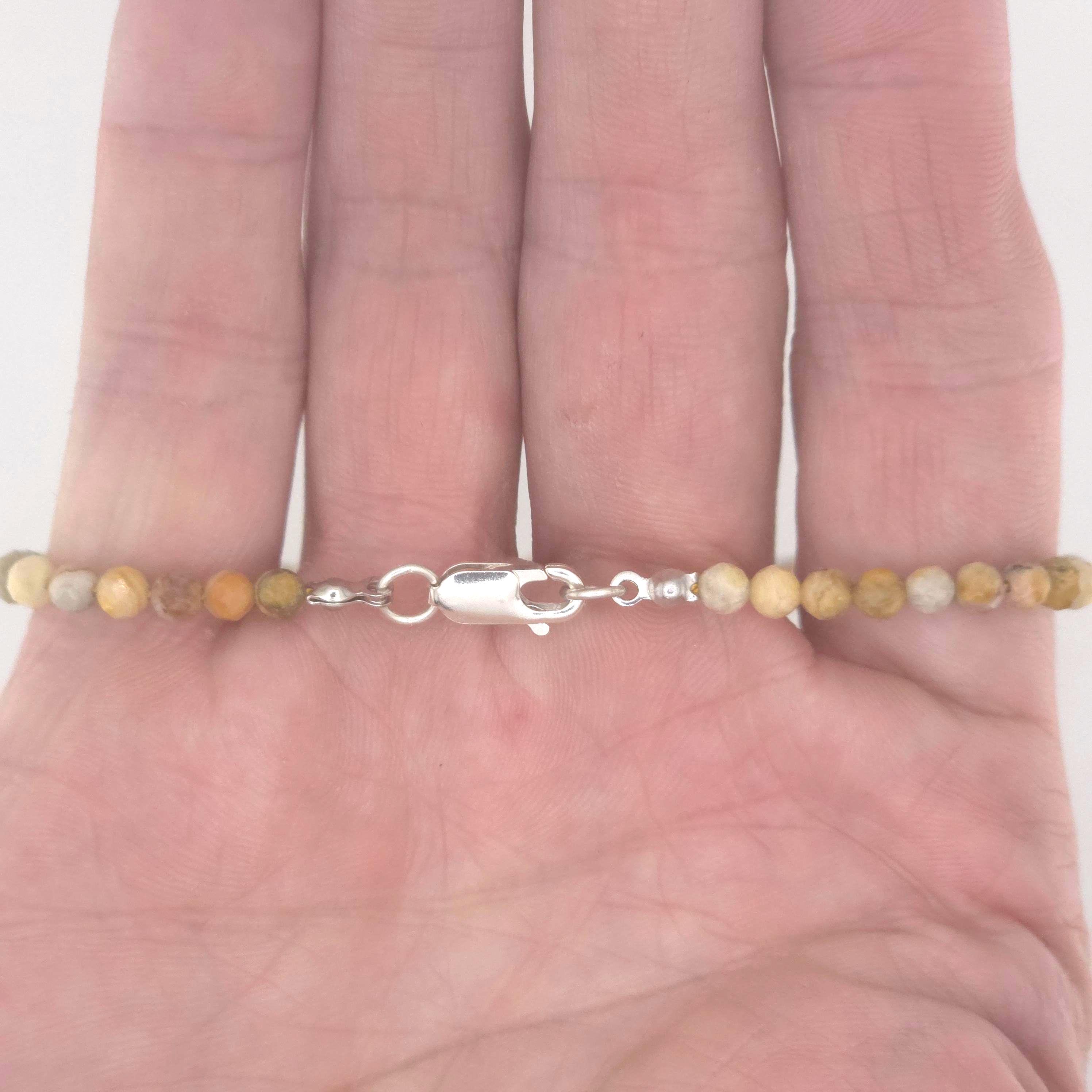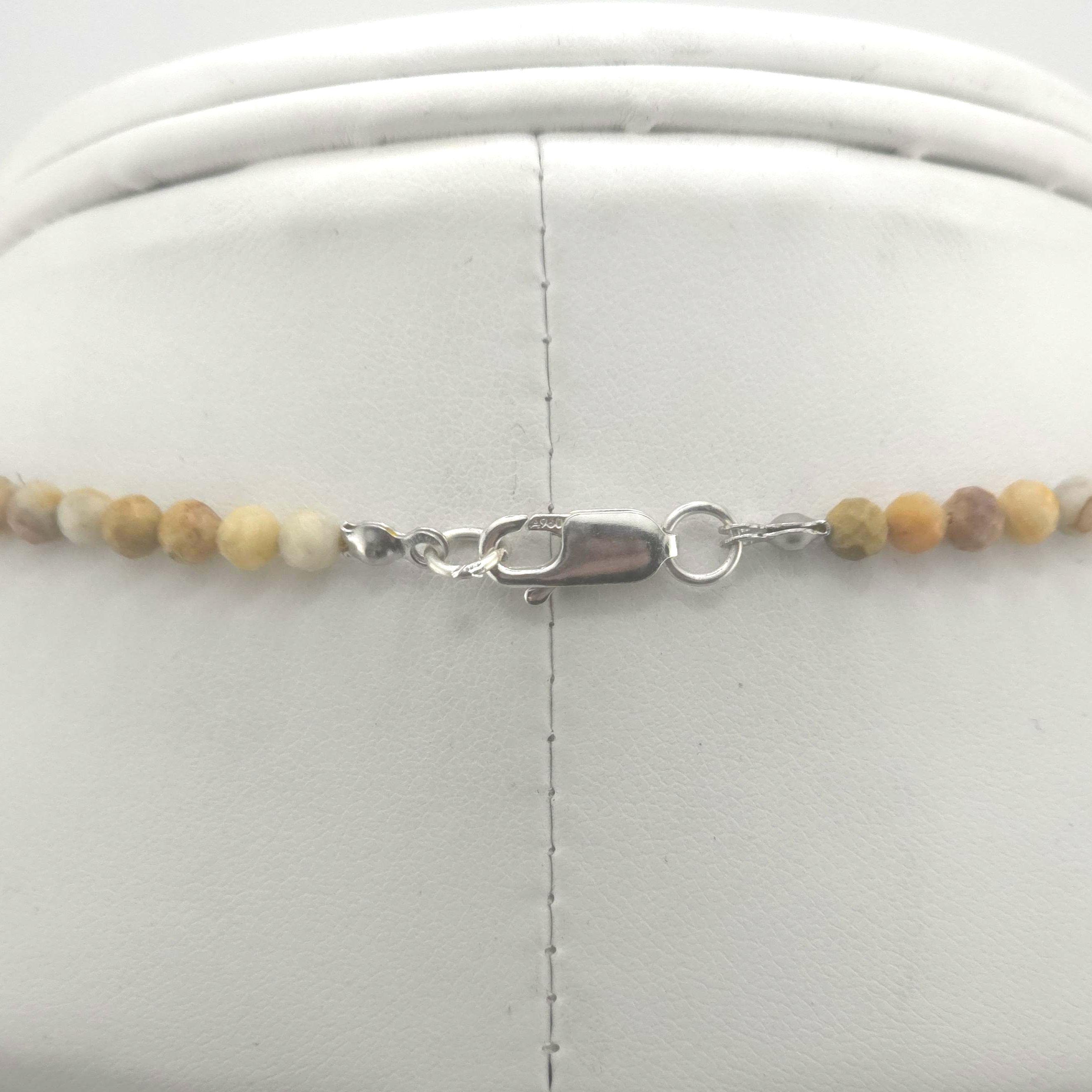 This single strand choker/necklace is made from all natural 4mm faceted Crazy Lace Agate on silk. It has gold-plated sterling silver and high quality gold colored stainless steel findings, and is finished with a high quality gold colored stainless steel magnetic clasp. The hypoallergenic version comes with all pure Argentium silver findings and will not cause a reaction with your skin and the metal.
