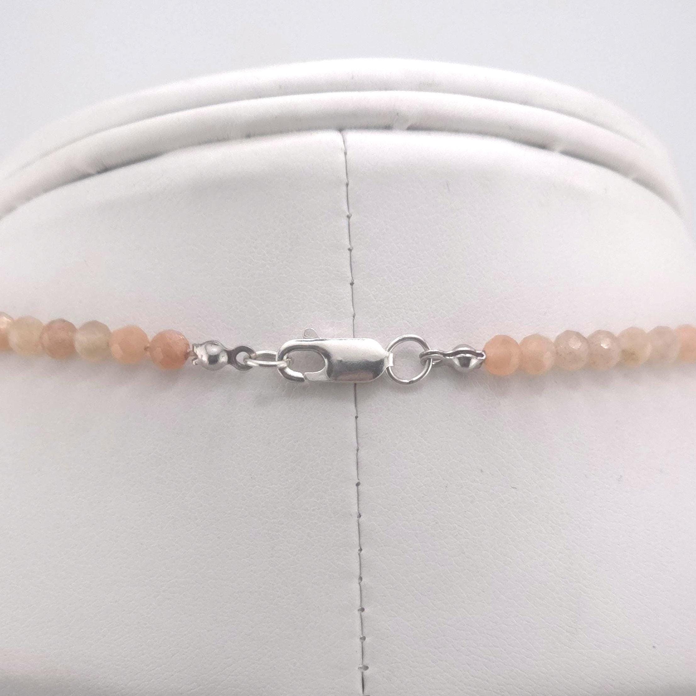 This single strand choker/necklace is made from all natural 4mm faceted Orange Peach Sunstone on silk. It has platinum-plated sterling silver and high quality stainless steel findings, and is finished with a high quality stainless steel magnetic clasp. The hypoallergenic version comes with all pure Argentium silver findings and will not cause a reaction with your skin and the metal.