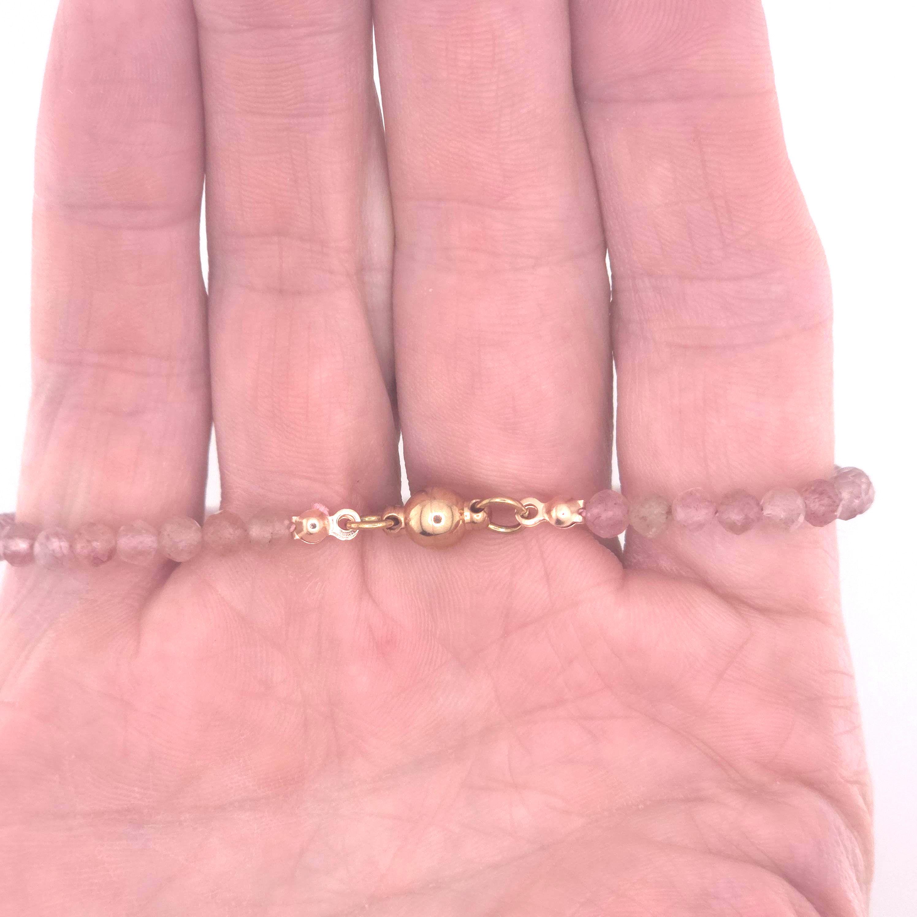 This choker/necklace is made with pure faceted 4mm Strawberry Quartz on silk, made to the size of your choosing. It has rose gold plated sterling silver and high quality stainless steel findings and is finished with a high quality stainless steel magnetic clasp. The hypoallergenic version comes with all pure Argentium silver findings and will not cause a reaction with your skin and the metal.
